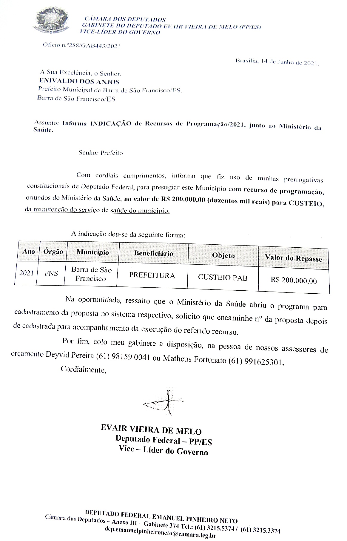 A informação do vereador Higor Soares, foi confirmada em correspondência enviada por Evair de Melo ao prefeito Enivaldo dos Anjos, onde na oportunidade, o parlamentar federal ressaltou que o Ministério da Saúde abriu o programa para cadastramento da proposta no sistema respectivo e que solicita encaminhamento do número da proposta depois de cadastrada para acompanhamento da execução do referido recurso.