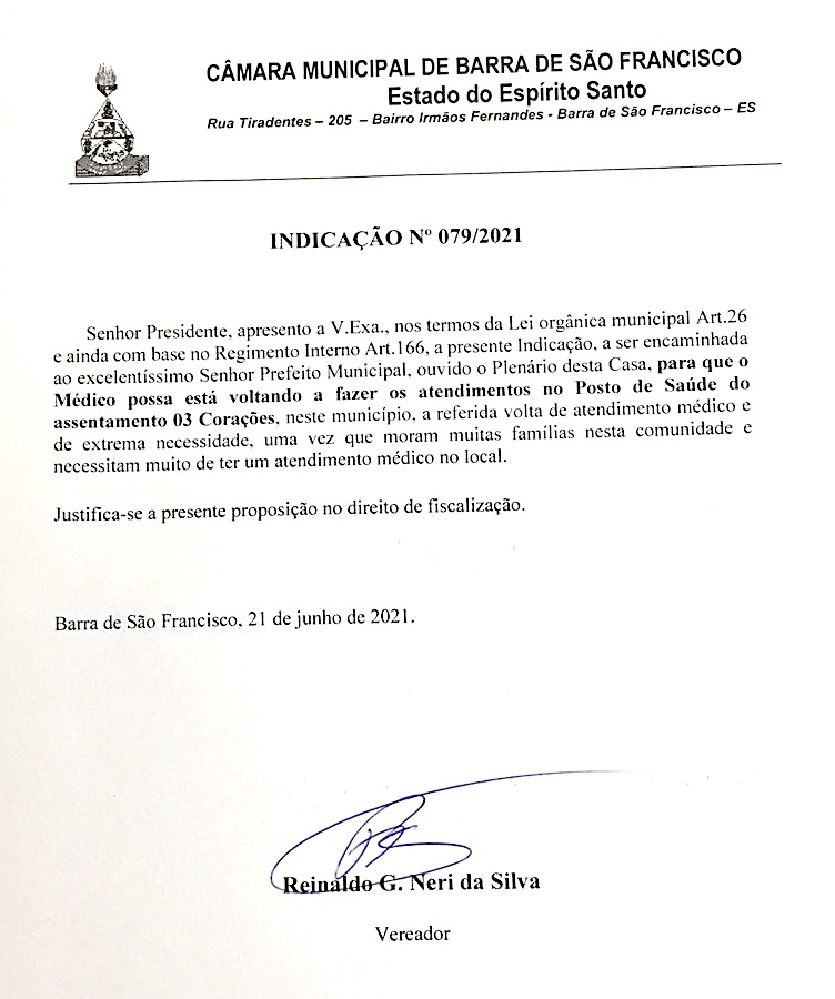 O vereador Reinaldo Neri – Borrinha, protocolou nesta segunda-feira dia 21, uma solicitação ao prefeito Enivaldo dos Anjos, no sentido de que o Posto de Saúde localizado no Assentamento Tres Corações, volte a oferecer atendimento médico para aquela comunidade.
