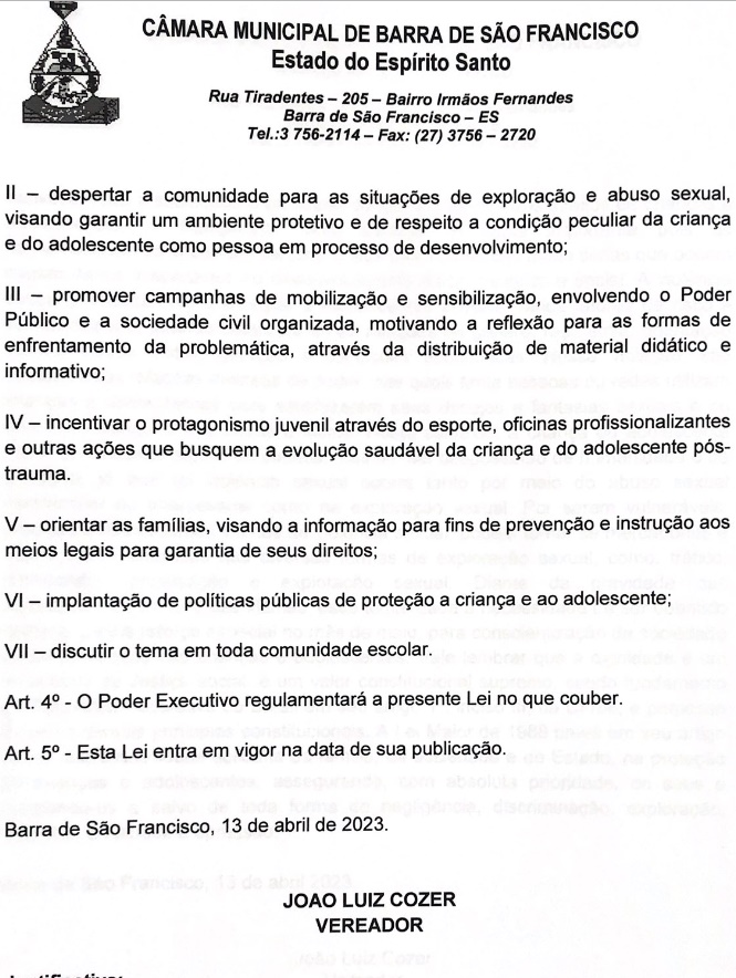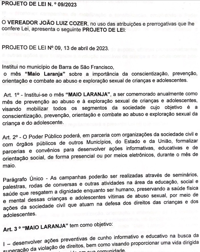 Na sessão de segunda feira dia 15, o vereador João Luiz Cozer - Lula, agradeceu ao prefeito Enivaldo dos Anjos por ter sancionado a Lei de sua autoria, que institui o mes de maio como "Maio Laranja". No último dia 02, o plenário reunido em sessão ordinária aprovou o parecer favorável da Comissão de Justiça, Legislação e Redação, ao Projeto de Lei nº 009/2023, de autoria do vereador João Luiz Cozer, instituindo no município de Barra de São Francisco/ES o mês “Maio Laranja”.