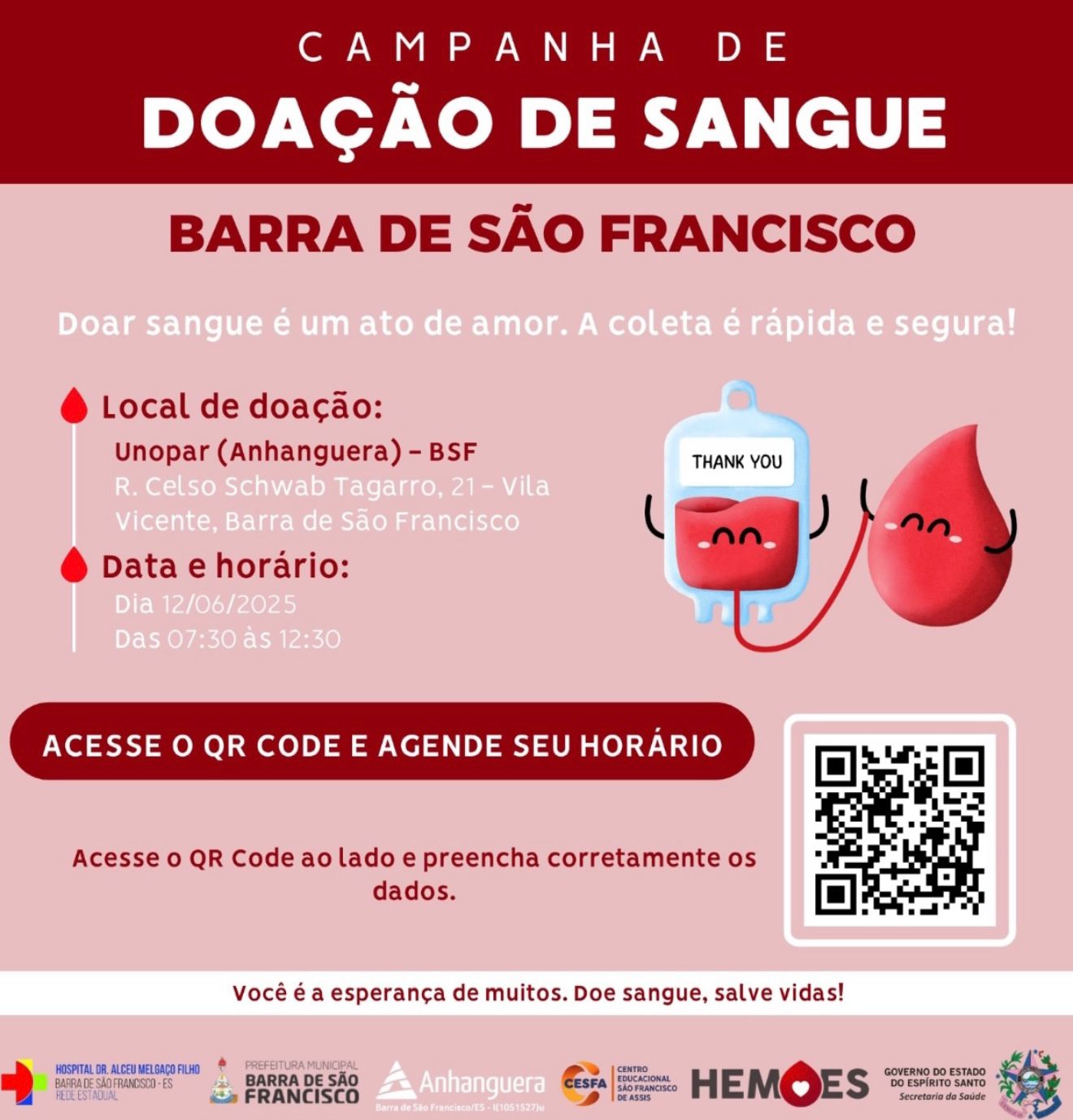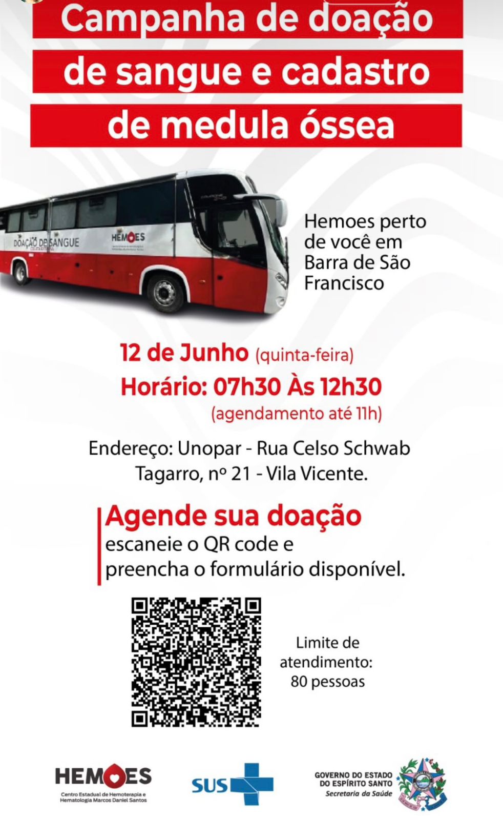 As coletas externas são estratégicas para ampliar o acesso à doação e aproximar o serviço das comunidades. Durante o mês de junho, estão previstas a realização de 10 coletas externas em várias empresas e em diversos municípios inclusive aqui em Barra de São Francisco na Unopar no bairro da Vila Vicente no próximo dia 12 quinta feira de 07:30 até 12 hs. Os doadores poderão agendar suas doações através do acesso ao QE-Code.