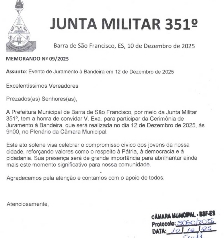 A Prefeitura de Barra de São Francisco promoverá, por meio da Secretaria Municipal de Direitos Humanos, Defesa da Cidadania e de Políticas para as Mulheres e a Junta Militar 351, a cerimônia de Juramento a Bandeira e entrega de Certificados de Dispensa Militar para que comparecerem ao ato cívico, a ser realizado na Câmara Municipal de Vereadores.