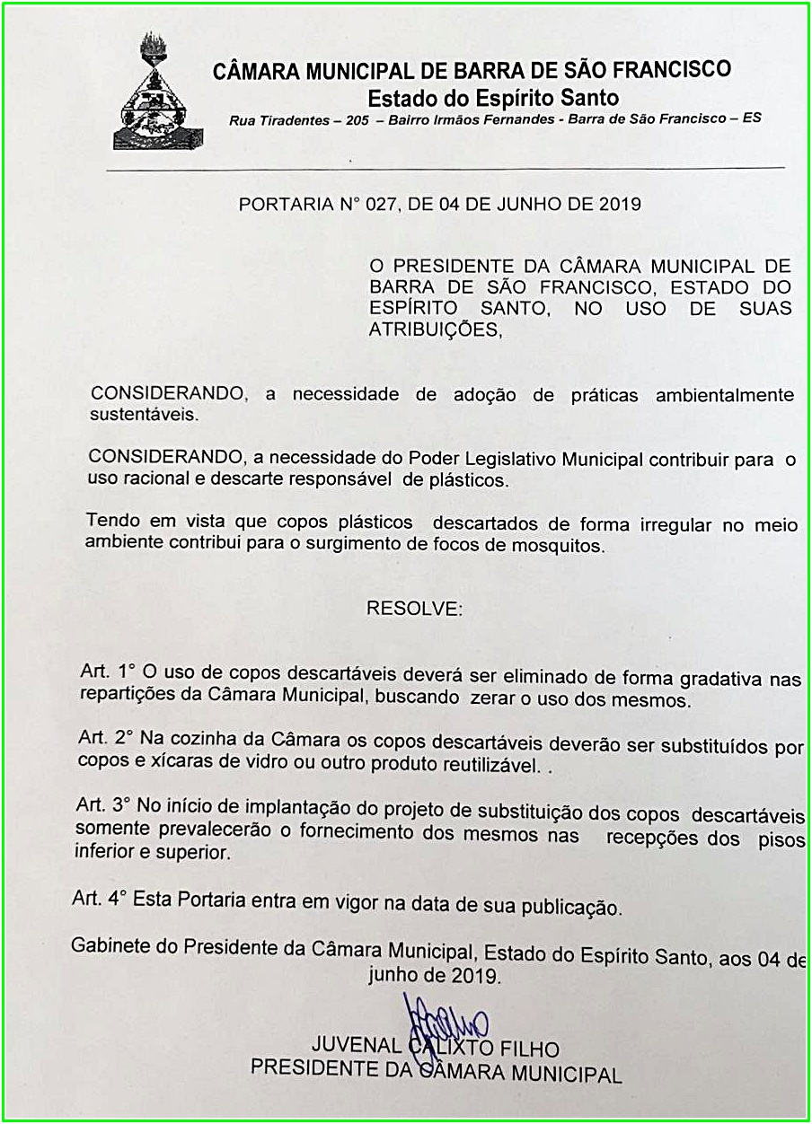 Nós da Câmara Municipal de Barra de São Francisco-ES, somos um dos primeiros parlamentos municipais do país, a adotar medidas na não utilização de copos descartáveis. Embora seja apenas uma pequena medida, a ação vai oferecer condições favoráveis para a não proliferação do mosquito transmissor da dengue, já que comprovadamente, os copos descartáveis, nem sempre são descartados e destruídos adequadamente.