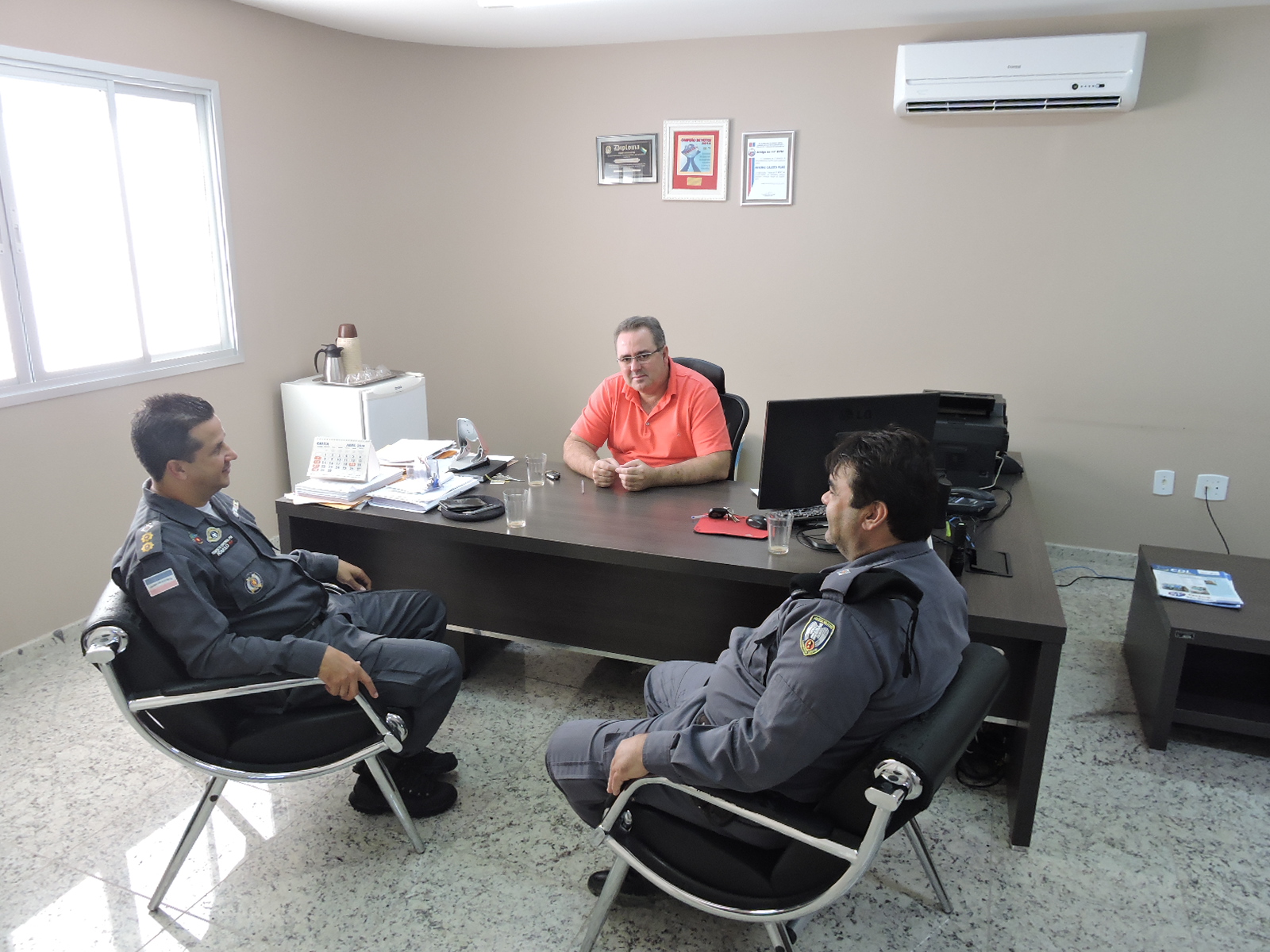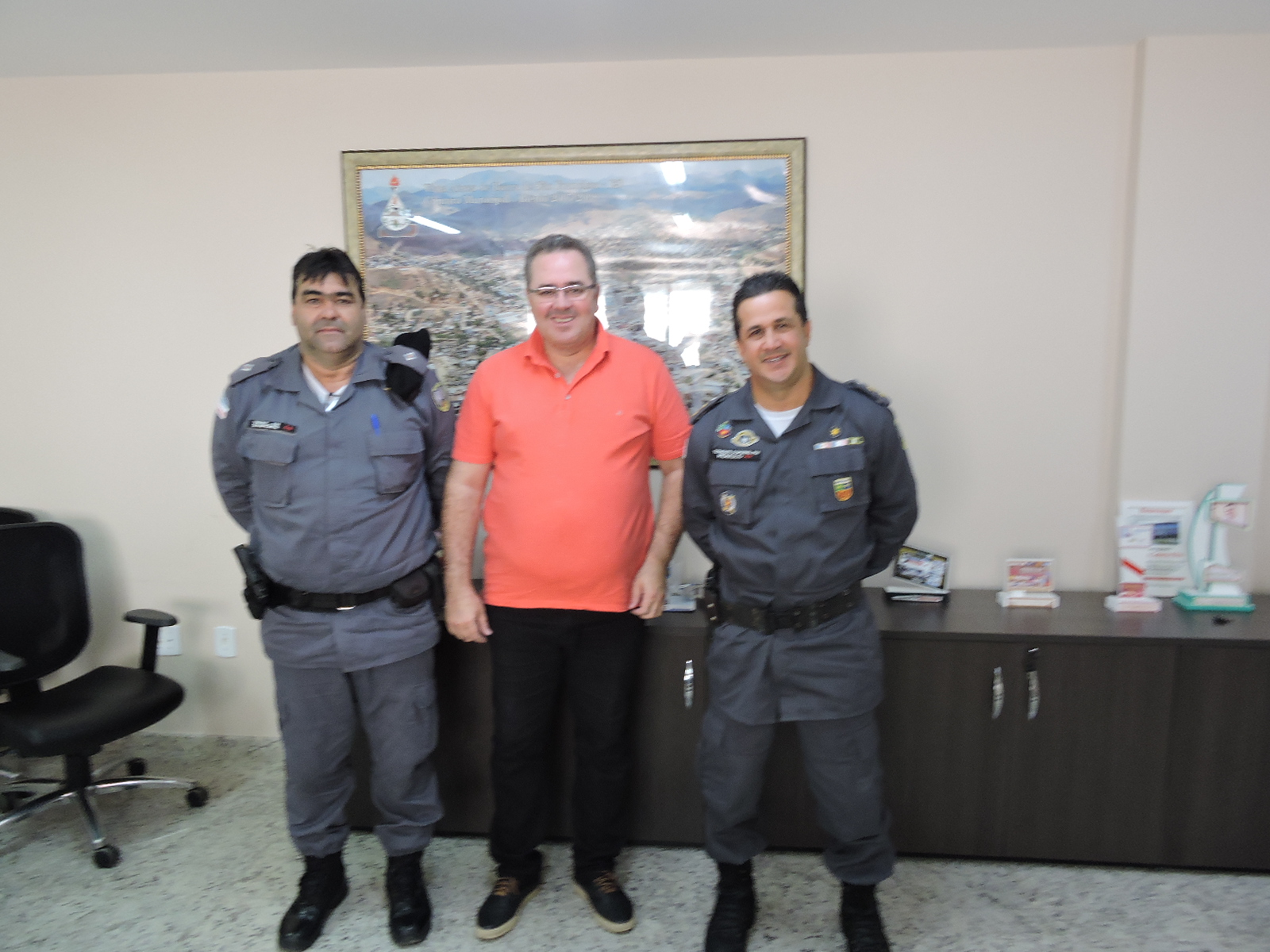 O comandante do 11º Batalhão da Polícia Militar de Barra de São Francisco, tenente coronel Rômulo Souza Dias acompanhado do tenente Valmer Simões, esteve visitando o gabinete do presidente da Câmara Municipal, vereador Juvenal Calixto Filho. Na oportunidade, embora a visita transcorresse em clima informal, o comando do Batalhão da Polícia Militar com sede no município e abrangência em outros da região noroeste, fez questão de apresentar alguns dados relacionados ao trabalho que vem sendo desenvolvido no setor de segurança local.