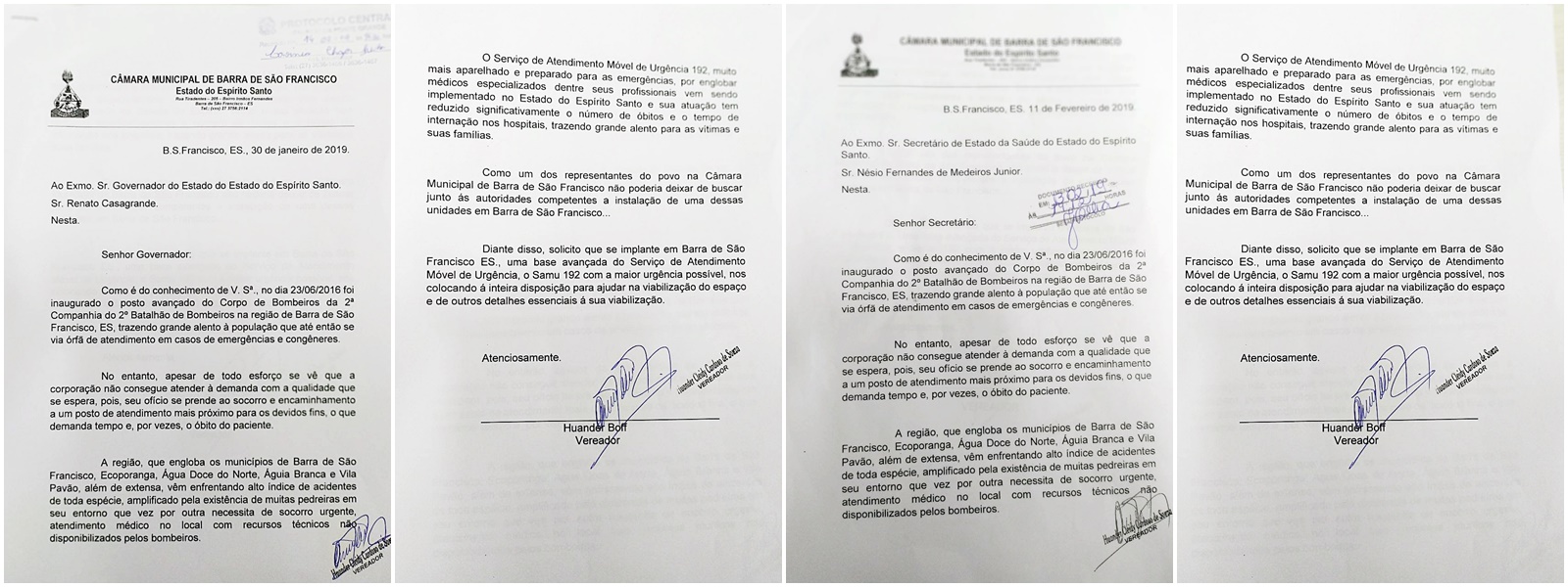 O vereador Hander Cleidy Cardoso de Souza – Bofe – (PSB), longo no início dos trabalhos legislativos do município, encaminhou ofícios ao governador Renato Casagrande e ao secretário de Estado da Saúde, NésioFernandes de Medeiros Junior, solicitando a implantação do Serviço de Atendimento Móvel de Urgência 192 (SAMU). A reivindicação justificada pelo parlamentar Bofe, é que quando ocorre a implantação desse sistema, por englobar médicos especializados e outros, significativamente ocorre uma redução do número de pacientes que vão a óbito, consequentemente reduzindo também o tempo de internação das vítimas nas unidades de saúde.
