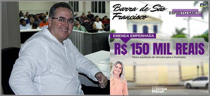 O presidente da Câmara Municipal, vereador Juvenal Calixto Filho (PS), já no início desse ano de 2020, recebeu por parte da deputada federal Soraya Manato (PSL) a informação de que já se encontram disponibilizadas as emendas de sua autoria junto do orçamento do governo federal, as quais garantem ao município de Barra de São Francisco, cerca de R$ 400 mil.